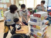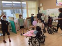 町畑小のみなさんが校内を見学した後、各グループに別れて活動しました。自己紹介ではお互い緊張している様子も見られましたが、町畑小のみなさんが目線を合わせてゆっくり話してくれたので、八一養のみんなもよく聞いていました。その後、ふれあい遊びやゲームを一緒に楽しみ、より仲良くなることができました。